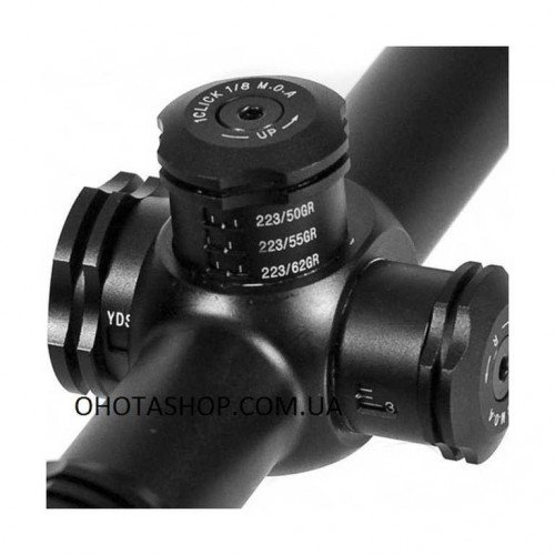 Барабаны ввода поправок по вертикали и горизонтали у прицела открытые, сконструированы по тактической схеме, и имеют цену деления 0.25 МОА. Барабан ввода вертикальных поправок имеет три шкалы с расстоянием, позволяющие точно и быстро вносить корректировки по вертикали на дистанции до 400 м. Каждая из трех шкал имеет градуировку, соответствующую конкретному весу патрона калибра .223 Remington (50 гран, 55 гран и 62 грана). Достаточно пристрелять винтовку на дистанции 100 м, после чего можно сразу выставлять на барабане необходимую дистанцию и точка прицеливания будет с учетом компенсации траектории падения пули при определенной дальности. Данная сетка верна при 10х увеличении. Для других увеличений линейные и угловые размеры определяются методом интерполяции, либо по специальным таблицам. Также конструкцией предусмотрена возможность калибровки барабанов для фиксации начальной точки ввода поправок на отметке "ноль", для чего в комплекте поставляется специальный шестигранный ключ.